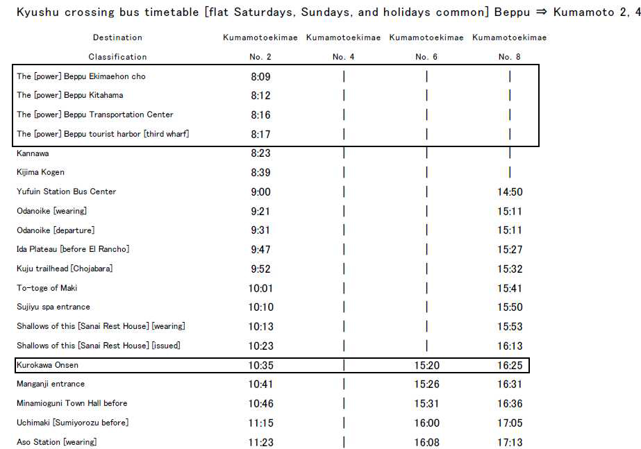 กำหนดคือ ออกจาก beppu เช้า รถบัสสาย 2 เที่ยวแรกประมาณ 8.15 ถึง kurokawa 10.35