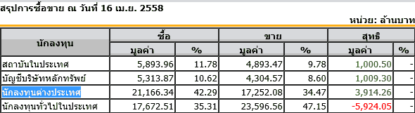 สรุปการซื้อขาย ณ วันที่ 16 เม.ย. 2558