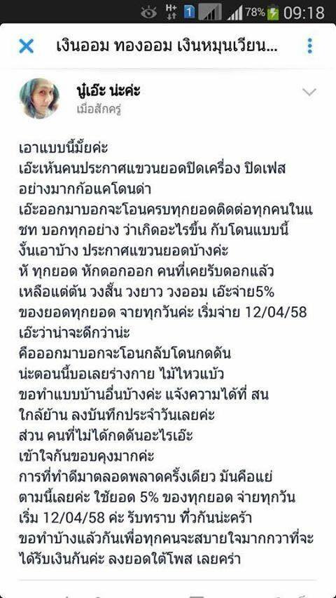 แน่นอนเธอตั้งแชร์ พอผ่านไปรอบที่ 1 คนได้เงินก้เริ่มลงรอบที่สอง สาม สี่ ห้า ไปเรื่อยๆ พอเธอเริ่มมีเครดิต เธอก็เริ่มเปิดวงออม โดยการออมนั้นได้ปั่นผลต่อ 3 วัน เหตุผลของเธอคือนำเงินไปปล่อยกู้รายวัน จึงสามารถมีเงินมาปันผลได้ และอีกเช่นกัน เธอเปิดวงออม ครั้งที่ 1 ผ่านไปด้วยดี จึงมีการต่อวงไปเรื่อยๆ โดยที่ทุกคนไม่ได้รู้ตัวว่าเริ่มติดกับดักเธอซะแล้ว พอการเงินเธอเริ่มสะดุด เธอก็เริ่มชวนรายใหญ่ๆที่ลงวงออม คนที่ขายเสื้อผ้าออนไลน์กับเธอให้ลงทุนปล่อยกู้ร่วมกัน กะทั้งเพื่อนๆที่รู้กันเธอ ทุกคนโดนกันอย่างน้อยหลักหลายหมื่นจนถึงหลักแสน จนวันนึงเธอเริ่มหยุด รึเธอได้ยอดเงินที่มากพอเราก็ไม่ทราบได้ เธอก็เริ่มมีการไม่จ่ายโดยที่เธอ Inbox ไปหาเจ้าของเงินโดยตรง อ้างเหตุผลใส่ไฟให้ระแวงกันเองในวง ว่าคนนั้นส่งไม่ดี คนนี้ส่งช้า คนโน้นยืมตังไป สุดท้ายเหมือนฟ้าเป็นใจ ในวันที่เฟสล่ม ก่อนเทศการสงกรานต์ เธอใช้เหตุในการหายหัวเพราะมีคนไปโพสทวงหน้าเฟสเธอว่า ก็เน็ตมันล่มดูไม่ได้ไง ถ้าตามกันแบบนี้ชั้นก็จะไม่จ่าย เหตุการณ์นี้เกิดขึ้นวันที่ 9 คะ โดยที่เธอบอกว่าชั้นน้อยใจ ที่มาทวงกันแบบนี้ ก็เลยจะพักก่อน เดี๋ยวมาคุยกัน 12 และแล้ว 12 ก็ผ่านไป เธอก็ยังหายหัวแถมด้วยการปิดเฟสหนี จนวันนี้ วันที่ 16 แล้ว เราก็ไม่ทราบว่าเธอจะออกมารับผิดชอบวันไหน พวกเราได้รวมตัวกัน แจ้งความในระดับหนึ่งแล้ว กระทู้นี้อยากให้เป้นอีกตัวอย่างนึง กรุณาอย่าสงสัย ทำไมไว้ใจ เพราะคงตอแบไม่ได้ เรื่องมันผ่านไปแล้ว