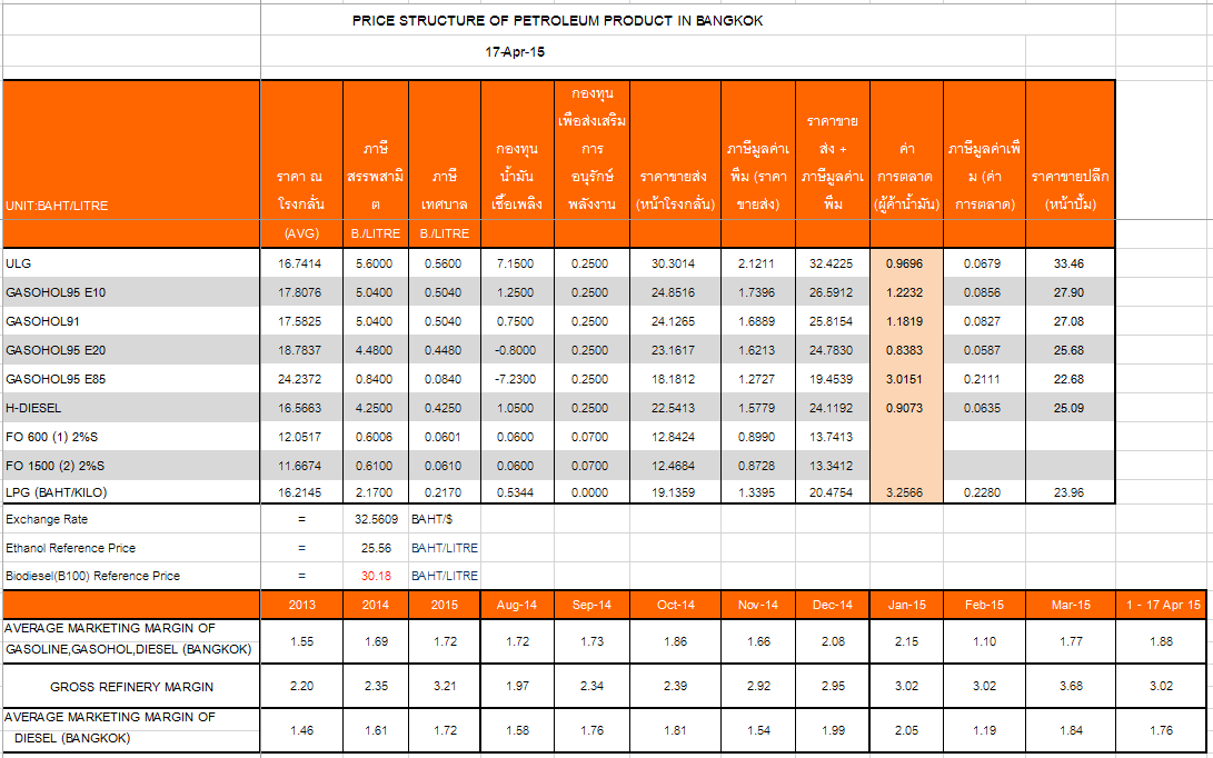 ส่วน น้ำมัน E85 ไม่เปลี่ยนแปลง โดยมีผลตั้งแต่วันที่ 18 เมษายน 2558 เป็นต้นไป