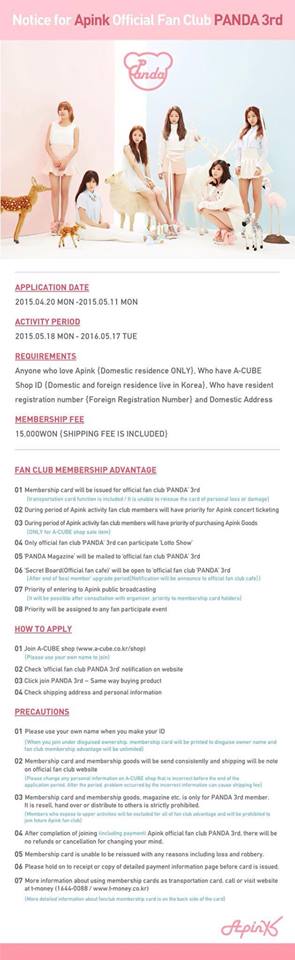 ที่มีชื่อว่า "Apink" ค่ะ แล้วทาง Website ของเอพิงค์ตอนนี้กำลังเปิดรับสมัคร Official fanclub อยู่ค่ะ (จะเป็นแฟนคลับที่มีบัตรสมาชิก มีสิทธ์สามารถซื้อของOfficial หรือซื้อบัตร Pre-Sale ในงานคอนหรืออีเวนท์ต่างๆก่อนแฟนคลับแบบธรรมดาได้ค่ะ) เราที่เป็นแฟนคลับก็อยากจะสมัครค่ะ เพราะมีโอกาสไปเที่ยวที่เกาหลีอยู่บ้าง แต่เงื่อนไขในการสมัคร ผู้สมัครจะต้องใช้ที่อยู่ของประเทศเกาหลีค่ะ นี่แหละปัญหาหนักเลย เพราะเราไม่มีที่อยู่ของประเทศเกาหลีค่ะ เลยอยากจะขอรบกวนขอยืมใช้ที่อยู่ เพราะทาง Website จะส่งบัตรสมาชิกมาทางที่อยู่ที่ลงทะเบียนไว้ค่ะ