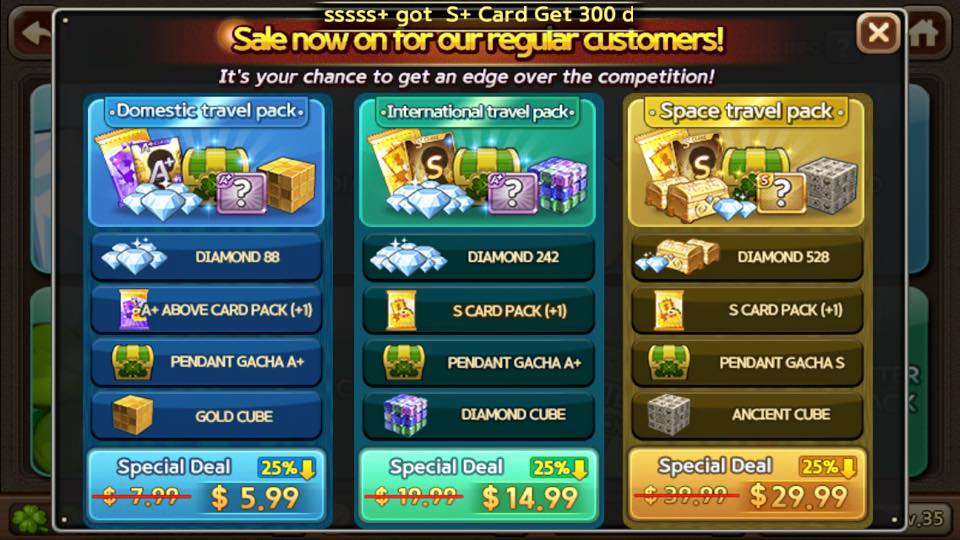 เคย Register แต่ไม่เคยเล่น ต่อมา Event ให้กลับมาเล่นโดยให้เพชร 300 เลยลองเล่นดู 1 วัน อยู่เปิดกล่องทองแล้วได้กล่องเพชร พอเปิดกล่องเพฃรได้ การ์ด S+ แต่ไม่รู้ว่าจะหาเงินมาจากไหนมาอัพเกรต http://s15.pos