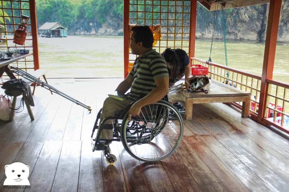 การลงแพของวีลแชร์ต้องทำใจนิดหนึ่งว่าไม่สามารถลงได้ด้วยตัวเอง แต่น้ำจิตน้ำใจของชาวแพและเพื่อนนักท่องเที่ยวทำให้การลงแพที่อุทยาแห่งชาติไทรโยคไม่โหดเกินไปนัก เมื่อวีลแชร์ลงไปถึงแพได้ก็วิ่งปร๋อ เพราะแพสมัยนี้พื้นเป็นไม้กระดานเรียบและแข็งแรง ไม่ใช่พื้นไม้ไผ่เหมือนแพสมัยก่อน รอไม่นานเจ้าของแพก็นำเรือมาลากจูงแพไปหาที่ผูกริมน้ำที่มีความเป็นส่วนตัว น่าเสียดายอยู่นิดหนึ่งว่า แพบางหลังมีบริการคาราโอเกะ แทนที่เราจะมาฟังเสียงลิงค่างบ่างชะนีและนกร้อง จึงต้องมาทนฟังเสียงชาวกรุงร้องคาราโอเกะกันลั่นป่า โชคดีที่เขากำหนดกันไว้ไม่เกินสี่ทุ่ม ขอบคุณที่ไม่ร้องกันทั้งคืน
