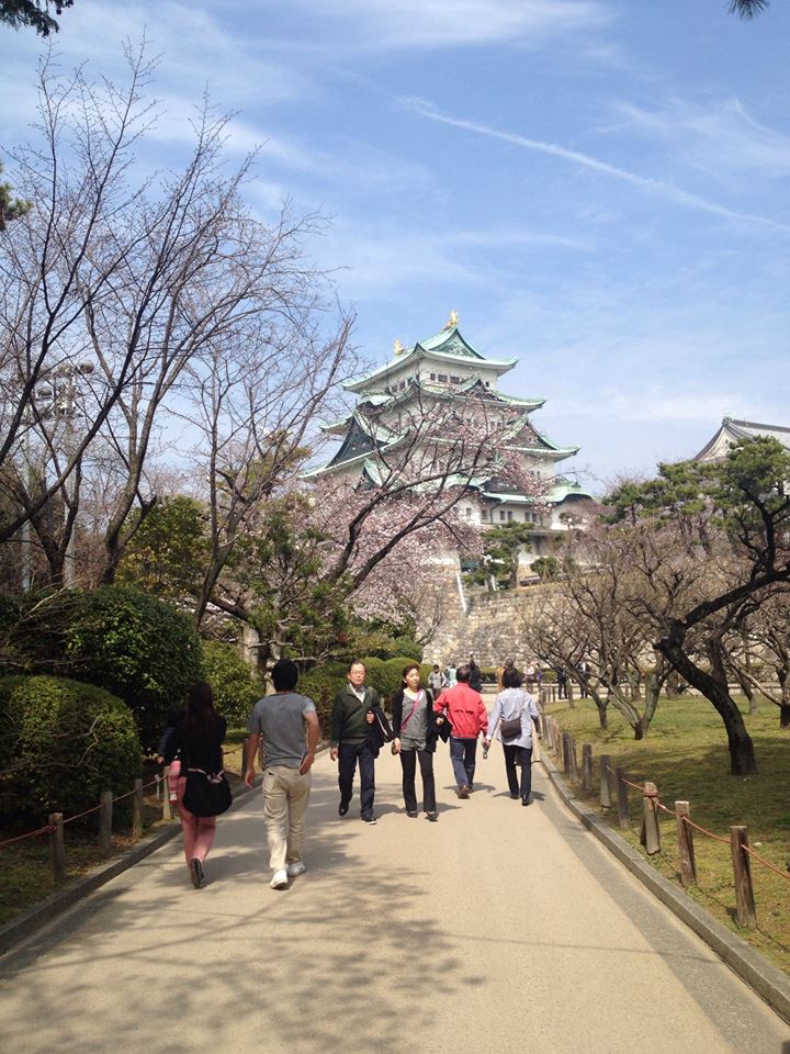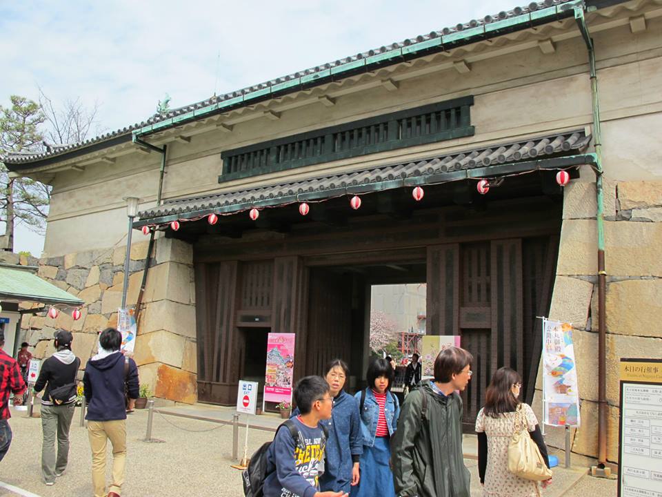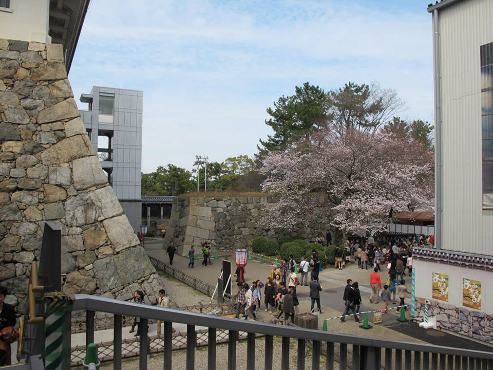 บรรยากาศข้างในเต็มไปด้วยดอกซากุระ มีนักท่องเที่ยวมากมายที่ชมความงดงามของตัวปราสาท