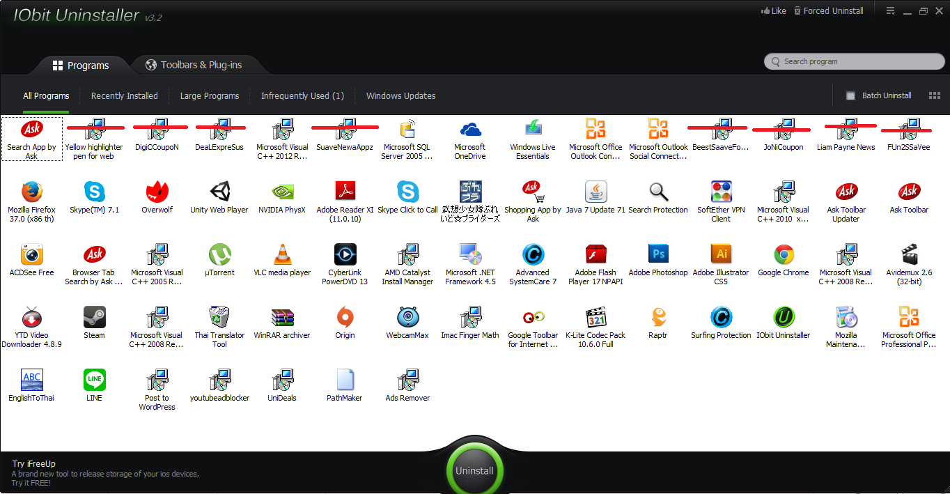 แต่ผมไม่รู้ว่าโปรเเกรมไหนครับ (ที่เห็นในภาพเป็นโปรเเกรมIObit Uninstaller ครับ) และเส้นสีแดงที่ขีดคือผมลบออกไปแล้วครัย แต่โปรเเกรมมันขึ้นแต่ชื่อเฉยๆครับ (ถ้าโปรเเกรมไหนที่เป็นโปรเเกรมขยะช่วยบอกด้วยนะครับเดี๋ยวผมจะลบออก)