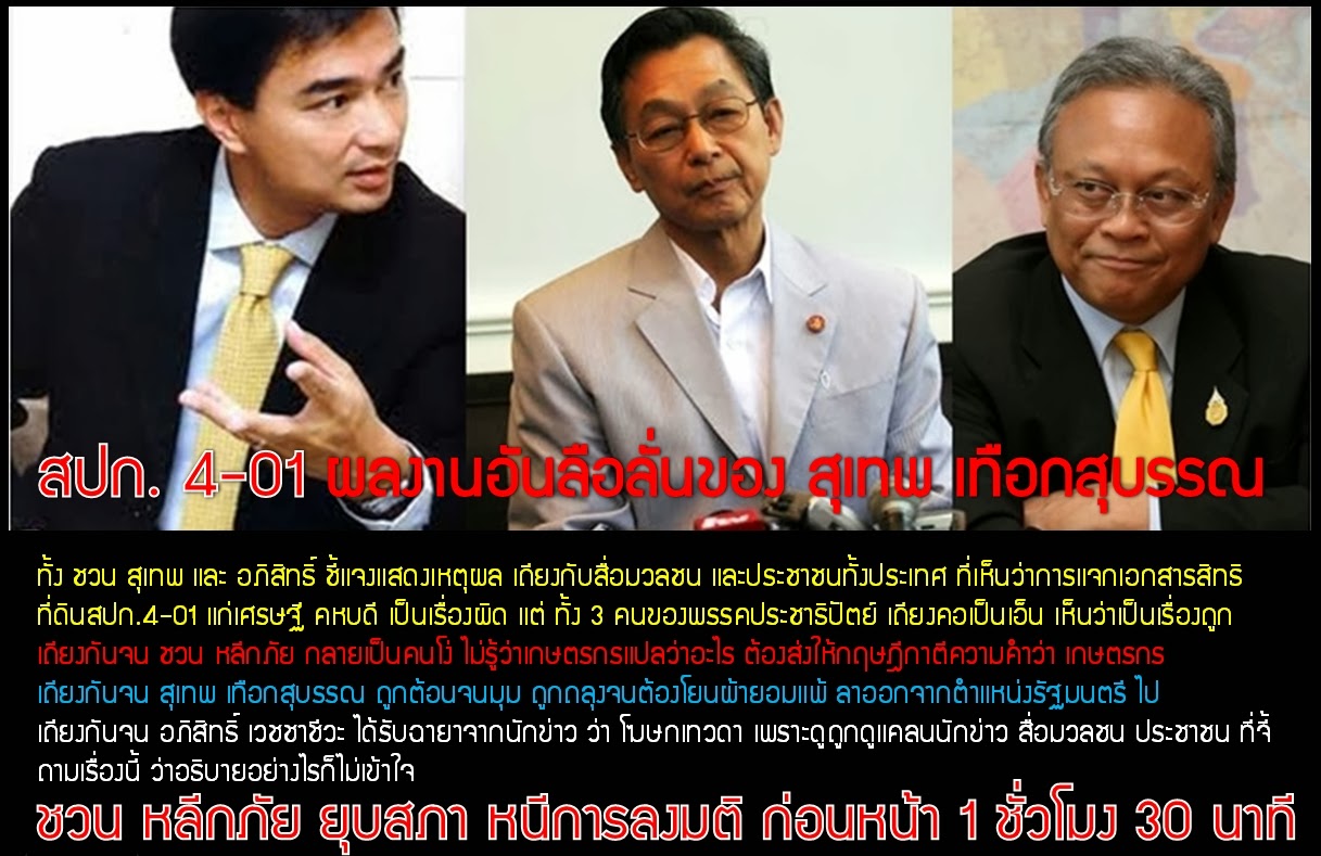 ในอดีตเรามีพรรคการเมืองใหญ่ เมื่อเป็นรัฐบาลออก ส.ป.ก. 4-01 ซึ่งเป็นที่ดินเพื่อให้เกษตรกรผู้มีรายได้ต่ำนำไปทำมาหากิน แต่ปรากฏว่ามีเศรษฐีหัวหมอนามสกุลใหญ่โตเข้าไปต่อคิวจับจอง กลายเป็นเรื่องฮือฮาถึงขนาดฝ่ายค้านอภิปรายรัฐบาลจนล้มมาแล้ว เหตุเพราะวัตถุประสงค์ของที่ดินไม่ได้มีไว้แจกคนรวย