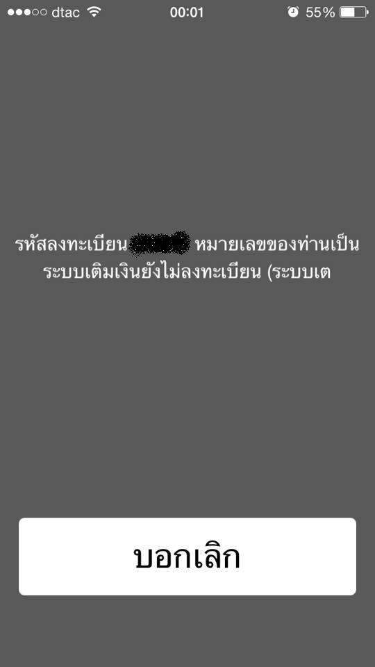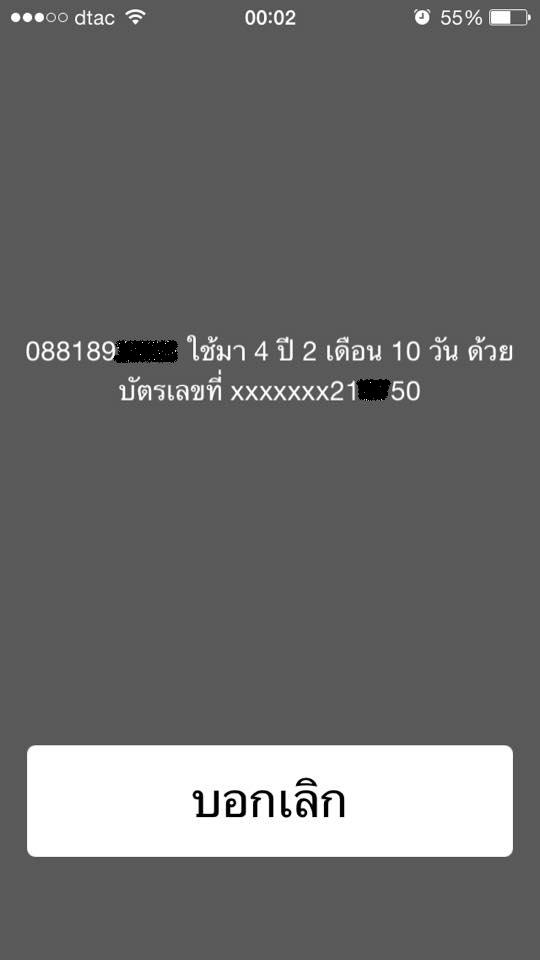 คือผม สอบถามหน่อย พอกด *102# ข้อความบอกว่า หมายเลขนี้ xxxxx ใช้มา6ปี 3เดือน 28 วัน ด้วยบัตรเลขที่ xxxx ลงทะเบียนซิมการ์ดยังครับ แบบนี้ พอกด *151# รหัสลงทะเบียน xxxx หมายเลขของท่านเป็นระบบเติมเงินยังไม