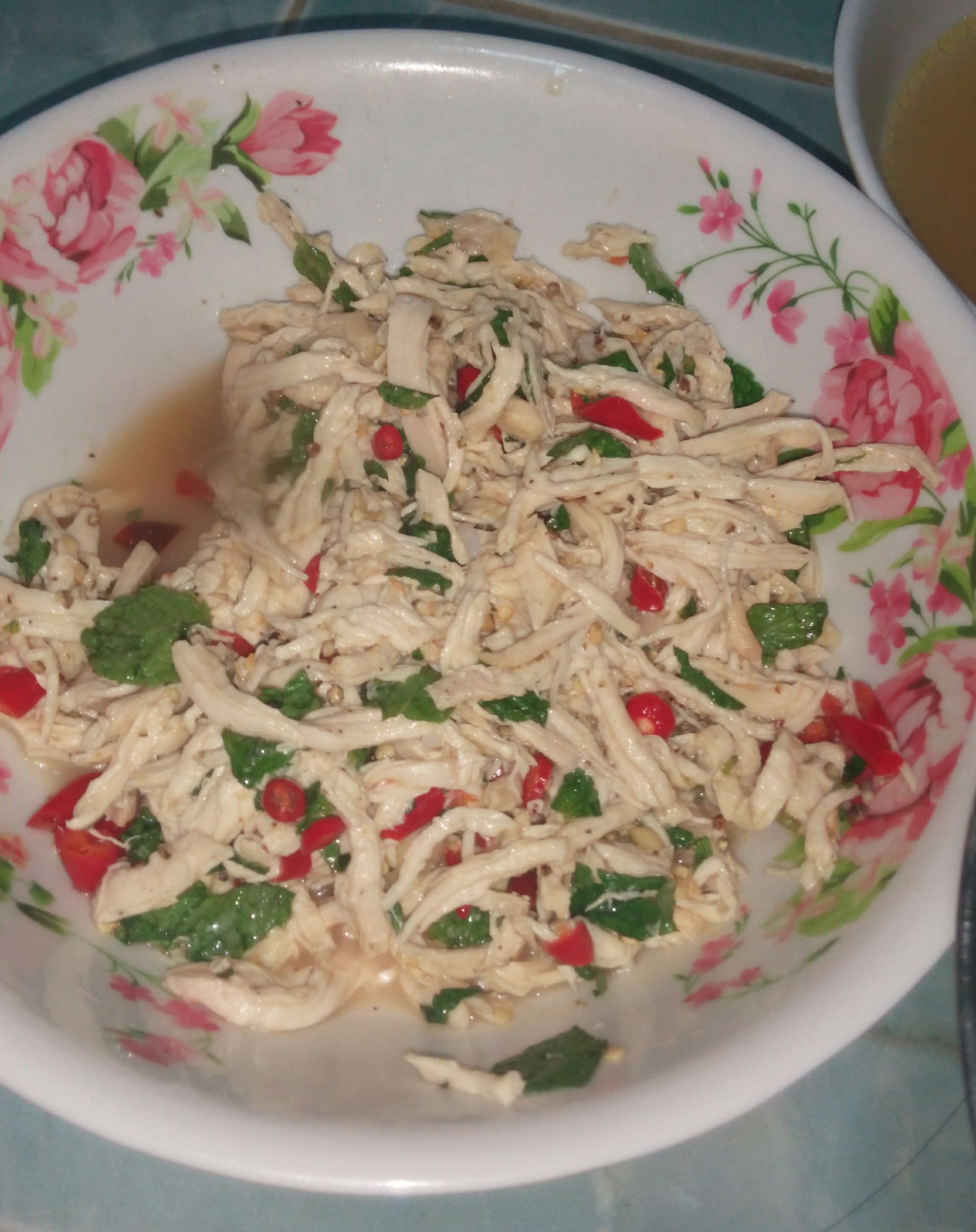 1.เอาเนื้อไก้ลงไปต้มทั้งชิ้นรอให้ไก่สุกและฉีกเนื้อเป็นเส้น ส่วนหนังไก่หั่นคะ