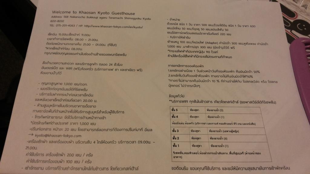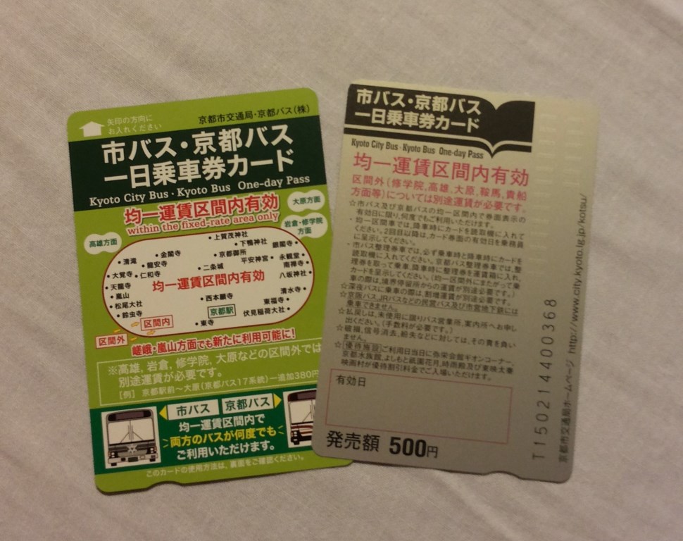 อันนี้คือภาพ Bus Pass ที่ใช้แล้วกับที่ยังไม่ได้ใช้ค่ะ จะเห็นความแตกต่างกันตรงที่บัตรที่ใช้แล้วจะมีการประทับวันที่ โดยการใช้ครั้งแรกให้เราสอดบัตรเข้าตรงเครื่องด้านข้างคนขับ ซึ่งไม่ต้องกังวลว่าจะงงเพราะคนขับจะชี้บอกเราว่าเราจะต้องสอดบัตรตรงไหนค่ะ(บ้านเราแบกกระเป๋าไปด้วยบางคนเลยให้คนขับช่วยสอดให้ซะเลย 555) หลังจากนั้นเมื่อมีการนั่งรถบัสอีกเราก็แค่โชว์วันที่ให้คนขับดูตอนลงเท่านั้นเอง โดยตอนซื้อบัสพาสเขาจะให้แผนที่รถบัสมาด้วยค่ะ(ซึ่งดีตรงที่มันใหญ่ แต่โดยรวมเราก็ควรจะดูมาไว้ก่อนว่าขึ้น-ลงตรงไหนแล้วอาจมาดูหน้างานอีกทีว่าป้ายตรงไหน) โดยทริปนี้เราเอากระเป๋ามาฝากที่ที่พักก่อนซึ่งที่พีกที่เลือกมาครั้งนี้คือ Khaosan Kyoto Guesthouse ค่ะซึ่งถือว่าดีทีเดียวค่ะ แถมยังมีภาษาไทยให้ด้วยนะ อิอิ