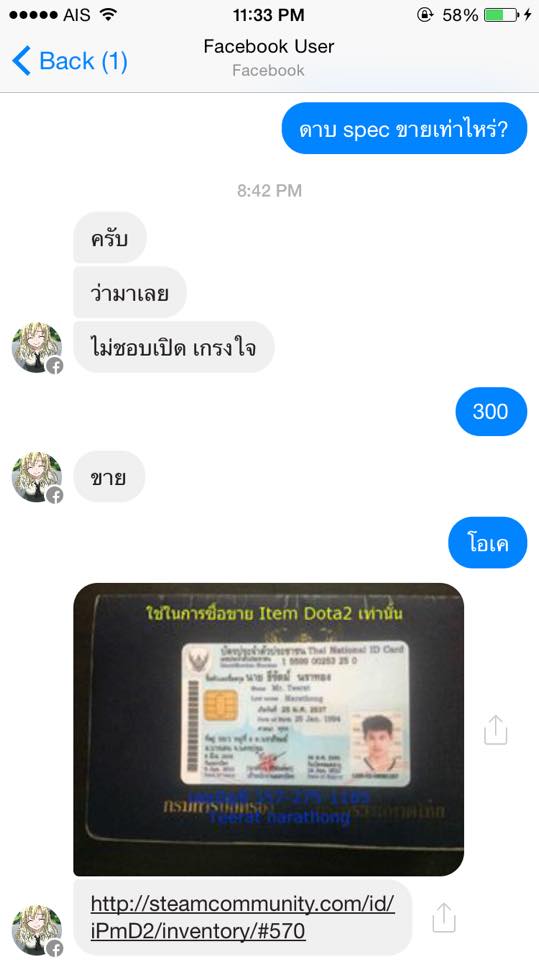 ผมได้ทำการติดต่อซื้อขาย item ในเกม (Dota2) ซึ่งผมก็ใช้เงินจริงซื้อนะ