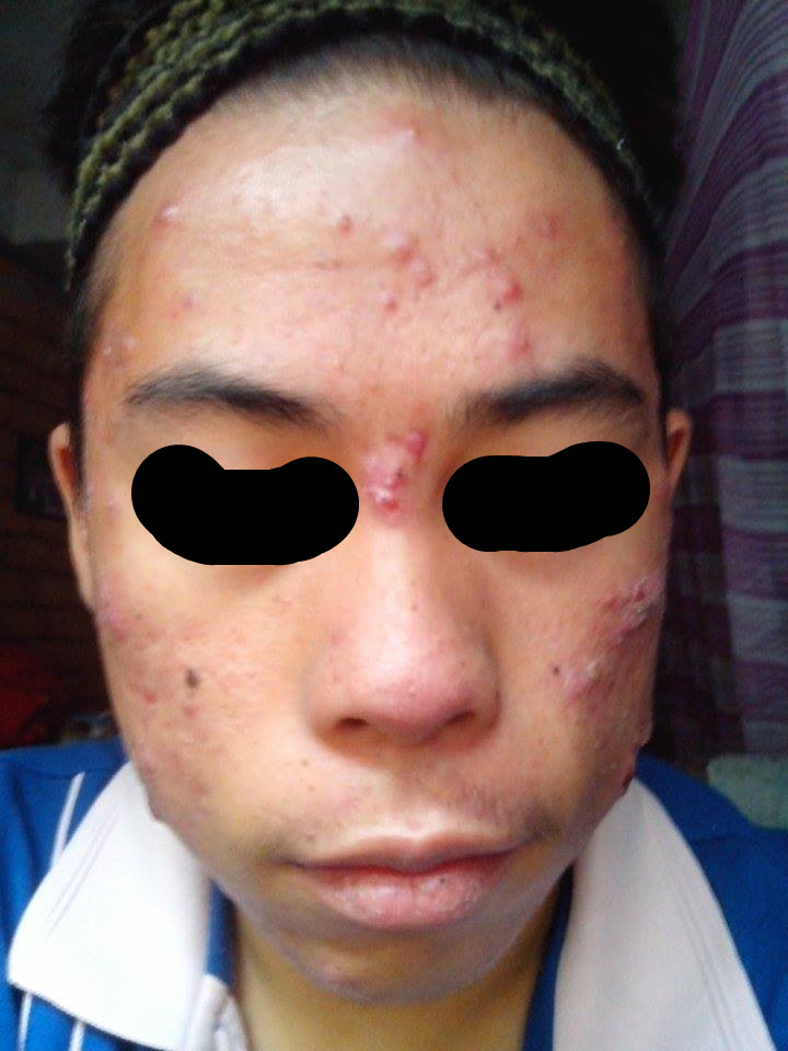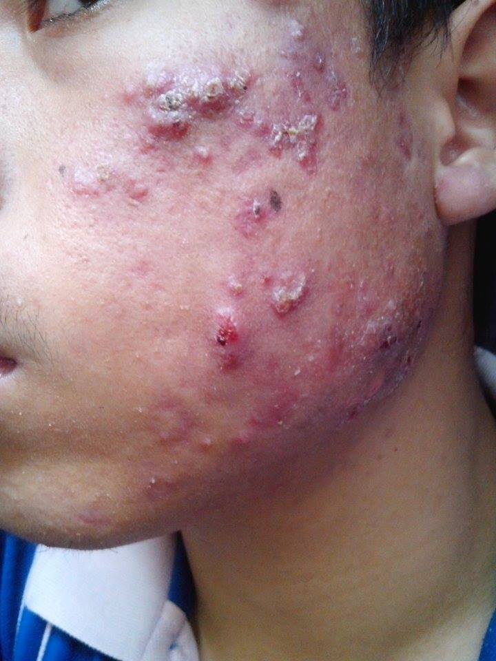 แต่ไม่ใช่สิวธรรมดานะเป็นสิวที่หนักมากๆหนักจนอยากเอากระดาษทรายมาขูดกันเลยทีเดียว ผมเป็นสิวมา 6 ปีแล้ว (ปัจจุบันจะขึ้น ปวช3) เป็นตั้งแต่ ม.1 แต่ช่วงนั้นไม่ได้เป็นมาก (ต้องขอโทษด้วยนะครับที่ไม่มีรูปช่วงนั้นให้ดูเอาคอมไปล้างทุกอย่างหายหมดเลยTT) เข้าเรื่องต่อ คือหลังจาก ม.1-ม.3 เป็นหนักบ้างน้อยบ้าง จนย้ายมา อีก ร.ร. เพื่อต่อ ปวช1 แล้วตอนปี 2 มันหายไปแล้วเพราะได้กินผลิตภัณฑ์ตัวหนึ่ง (ขอสงวนชื่อ) เป็นผลิตภัณฑ์กล่องสีฟ้าเม็ดยาใหญ่ๆวงรีนั้นแหละครับ กิน2 กล่องเพื่อนบอกว่ามันดีขึ้นมากๆ แต่ด้วยกำลังทรัพย์ทำให้เราไม่มีจะซื้อ เพราะ ผมอายุแค่ 18 ไม่อยากขอเงินพ่อแม่ จึงเลิกกินไปเดือนกว่าๆมันเริ่มกลับมาเป็นเหมือนเดิม แต่ช่วงนั้นยอมรับว่าล้างหน้าแค่ผลิตภัณฑ์ตัวเดียวก็คือ การ์นิเย่ ซึ่งมีเพื่อนแนะนำคือใช้ไปสักอาทิตย์มันดีขึ้น แต่ก็ไม่ได้หายไปทั้งหมด ปัจจุบันตอนนี้ยังใช้อยู่ ส่วนตัวผมแล้วเป็นคนนอนดึกมากๆ นอนเวลาประมาณ เที่ยงคืน ทุกวัน แล้วช่วงปิดเทอมนี้ผมได้ไปอาศัยอยู่บ้านอาเพื่อเรียนอังกฤษอยู่บ้านอาเกือบจะเดือนแล้ว ปกติบ้านอาจะเข้านอนกันประมาณตี 2-3 เพราะอามีแฟนฝรั่งคนละซีกโลกและเคยไปใช้ชีวิตที่นั่น20กว่าปี เข้าเรื่องต่อผมก็ติดนอนดึกไปกับอาด้วย จึงทำให้สิวเห่อมากๆ และอาได้ซื้อผลิตภัณฑ์กับยาให้ผมทานคือ BENZAC AC 5 ทาก่อนล้างหน้า แล้วก็ ACNOTIN 10 ที่ซื้อที่เภสัช เจ้า ACNOTIN 10 ผมทานหมดไป 2 แผงแล้ว เมื่อก่อนผมก็เคยทานตอนรักษาที่คลินิคเมื่อก่อนทานไม่นานก็หายแต่เดี๋ยวนี้รู้สึกว่ามันใช้เวลามากกว่าเมื่อก่อน แล้วตอนนี้ผมกลับมาบ้านได้ 5 วันแล้วแล้วผมลืมเอาโฟมล้างหน้าและ BENZAC มาด้วยจึงได้ล้างแต่น้ำเปล่ากับทาน ACNOTIN คืออยากบอกว่า สิวก่อนกินยากับทายามันลดลงไปเยอะอยู่แต่มันก็เพิ่มมาเยอะเหมือนกัน ไปอ่านในวิธีใช้ ACNOTIN (ทั้งๆที่กินหมดไปแล้ว 2 แผง พึ่งมาหาข้อมูล-..-) เค้าบอกว่า ช่วงแรกมันเห่อ ออกมาก่อน แล้วค่อยหายไป แต่นี่มันนานมากแล้วก็ไม่หายสักกะที และนี่คือรูปปัจุบัน ถ่ายวันนี้ 25/4/58 สภาพก็แบบนี้แหละครับจะรักษายังไงดีแต่สิวมันเป็นสิวไม่มีหัวมันมีแต่หนังแห้งและพอแกะออกมามันไม่มีหัวสิวหรือหนองแต่อย่างใดมันเป็นเนื้ออะครับหรือหัวสิวมันซ่อนอยู่ข้างใน หรือ มันไม่ใช่สิว รักษายังไงดีครับTT ทุกข์ใจมากๆเลย