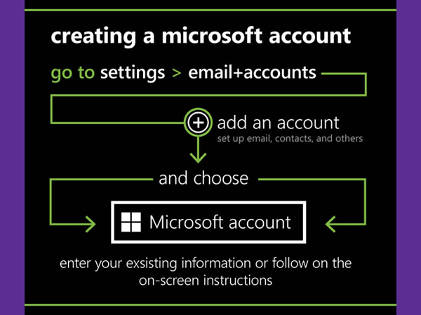 2. สร้างบัญชีรายชื่อ สามารถสร้างบัญชีได้โดยเข้าไปหน้าการตั้งค่า เลือกอีเมล์+บัญชี (Email-Accounts) แล้วไปที่เพิ่มบัญชี (Add Account) หากต้องการใช้บัญชีจากให้ผู้บริการรายใด ก็กดเลือก เช่น บัญชีของ Microsoft เมื่อเข้าสู่ระบบแล้ว ข้อมูลต่างๆ ไม่ว่าจะเป็นอีเมล์, เบอร์ติดต่อ, ปฏิทิน, Cloud ก็จะมาอยู่ในเครื่อง Lumia ของคุณ