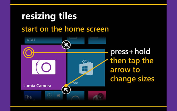 3. แก้ไข Tiles ในหน้า Home Screen หากต้องการจะปรับเปลี่ยนส่วนขยายของแอปฯ ใดให้กดค้างไว้ แล้วเลือกลูกศร หากพอใจแบบไหนแล้ว ให้แตะหน้าจอหนึ่งที
