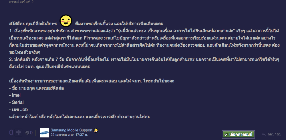 สืบเนื่องจากกระทู้ร้องเรียนงานบริการของโทรศัพท์มือถือยี่ห้อ Samsung ที่เราได้โพสเอาไว้