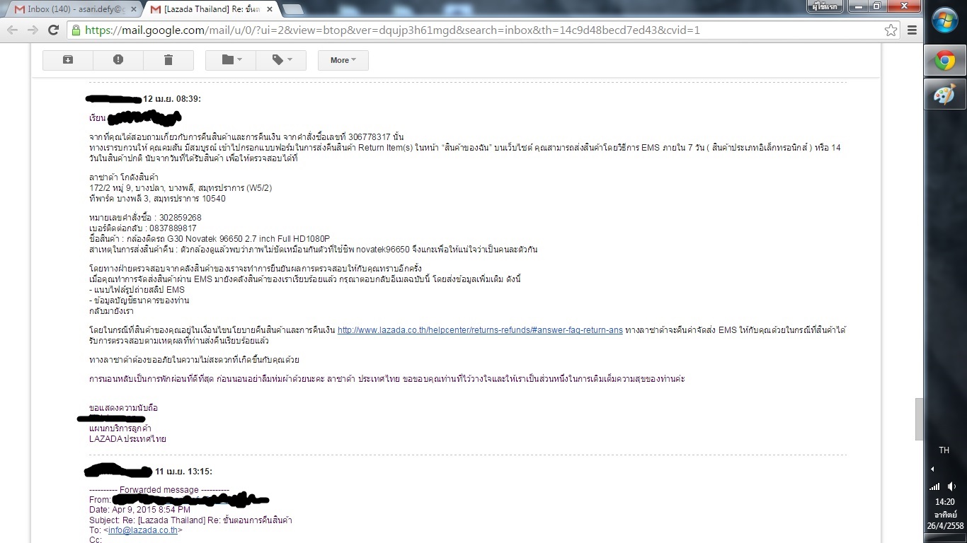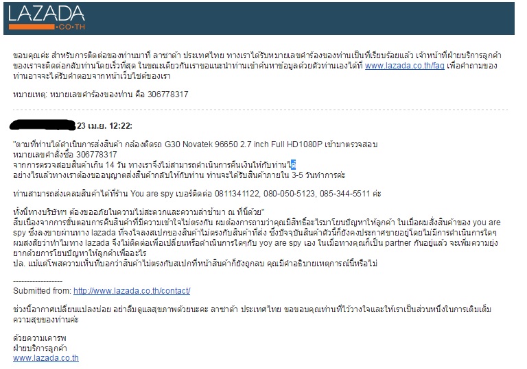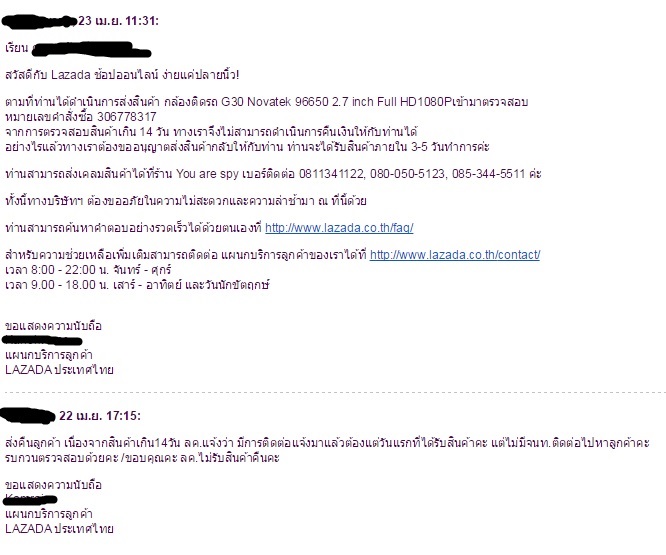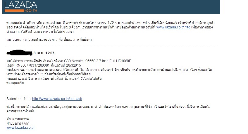 หลังจากนั่งช๊อคไปหนึ่งคืนก็ทำเรื่องเพื่อคืนสินค้า ซึ่งหลังจากตรงนี้คือความผิดพลาดที่แย่มาก คือตั้งแต่ขั้นตอนการซื้อ โอนเงิน และส่งของ จะมีเมล์จาก lazada มาแจ้งตลอด แต่พอผมเดินเรื่องคืนสินค้าหน้าเว็บ ดำเนินการเรียบร้อย ปริ๊นคืนมาเรียบร้อย ก็รอว่าจะมีเมล์ส่งมาแจ้งเพื่อจะได้ส่งของ ช่วงนั้นก็งานยุ่งจนลืม นึกขึ้นได้อีกทีก็เกือบสองสัปดาห์ จึงได้ส่งข้อความติดต่อเพื่อสอบถามรายละเอียดกับทางเว็บ
