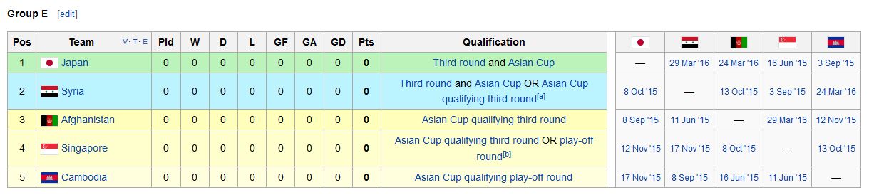 World Cup Group E: Japan, Syria, Afghanistan, Singapore, Cambodia.