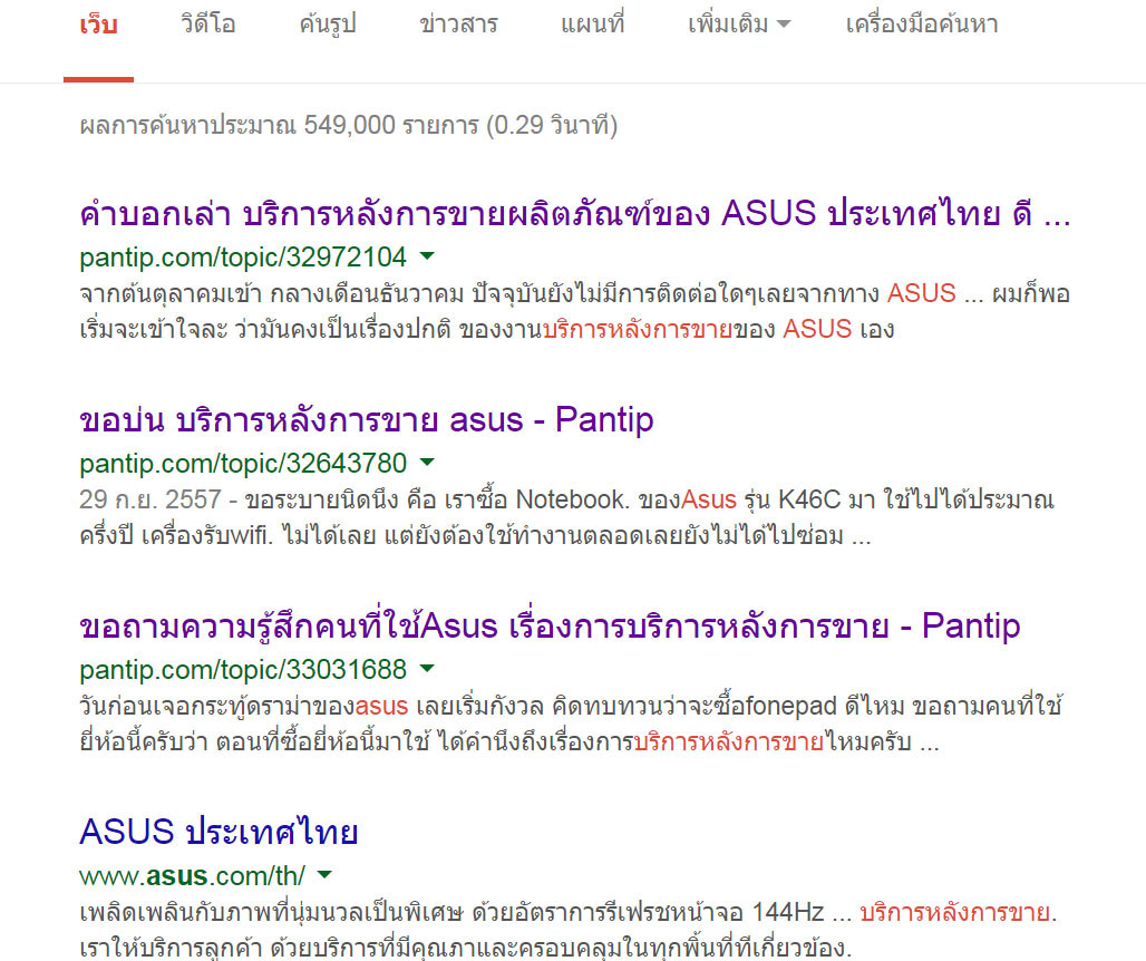 ถึงเวลาค้นหาข้อมูลใน Internet แล้ว พิมพ์เลย…!!! บริการหลังการขาย Asus และนี่คือพลังของ SEO กระทู้ Pantip ขึ้น 3 อันดับแรกแซง Asus Official Website ได้ซะงั้น แถมเป็นกระทู้ที่วิจารณ์บริการหลังการขายแบบไม่ค่อยดีด้วย