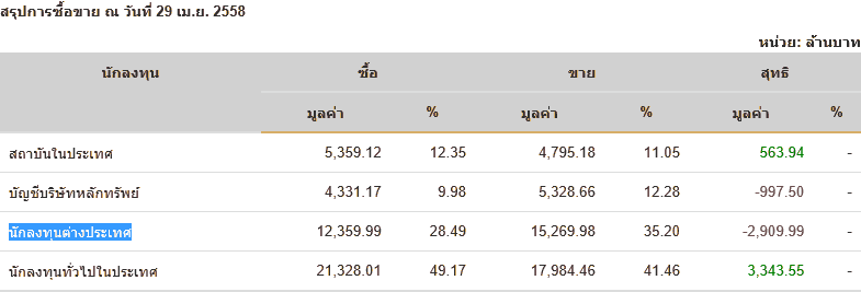 Sinthorn Summary 29/4/2558 : ต่างชาติขายสุทธิ -2,909.99 ลบ.