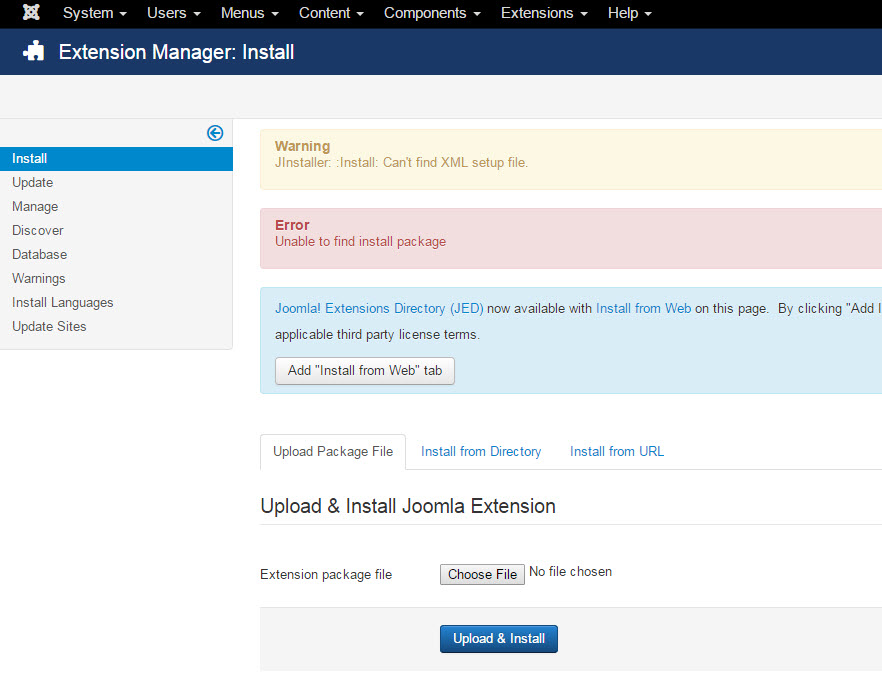 JInstaller: :Install: Can't find XML setup file.