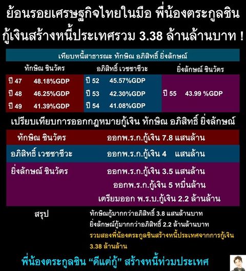 ไม่ทราบว่าคุณรู้หรือเปล่าว่ารัฐบาลอภิสิทธิ์ทำให้จีดีพีที่ติดลบกลับมาเป็นบวก และในปี 53 จีดีพีสูงถึง 7.5 ในขณะที่หนี้สาธารณะอยู่ที่ 41 กว่า %