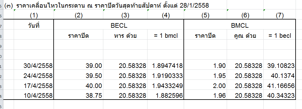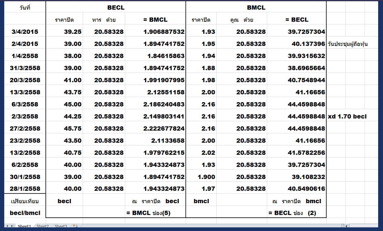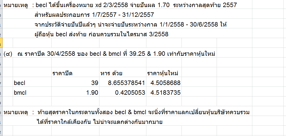 ระหว่างนี้ราคาทั้งสองจะแกว่งได้เปรียบเสียเปรียบสลับกันไปมา และแล้วใกล้ๆเวลาควบรวมตามข่าวไตรมาส 3/2558 ทั้ง becl และ bmcl น่าจะเล่นที่ราคาแปลงเป็นหุ้นใหม่ตามสัดส่วน ข้างบน ใกล้ๆกัน มีส่วนต่างเล็กน้อยปั