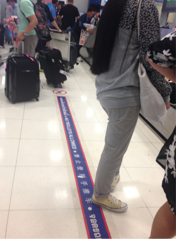 เส้นนี้บอกอะไรเรา..?? ชัดเจนค่ะ ภาษาไทยเต็มตา "จอดรถเข็นกระเป๋าบริเวณนี้" นั่นหมายความว่ารถเข็นห้ามเข้าไปในเส้น รวมถึงตัวเจ้าของกระเป๋าด้วย (ในกรณีที่กระเป๋าเรายังไม่มา) แต่หากกระเป๋าเรามาแล้วก็เชิญก้าวเข้าไปในเส้นเพื่อยกได้ไม่มีปัญหา