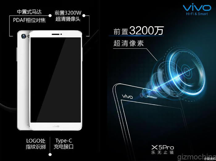 ยิ่งใกล้คลอด ยิ่งลือหนัก ล่าสุดสื่อจีนเผย vivo X5 Pro ติดตั้งกล้องด้านหน้า ความละเอียดสูงถึง 32 ล้านพิกเซล ส่วนกล้องตัวหลักจะมาพร้อมระบบออโต้โฟกัสแบบ Phase Detection (PDAF) ทำงานบนระบบปฏิบัติการ Android 5.0 Lollipop ขุมพลัง Snapdragon 615 Octa Core จอแสดงผล Full HD 1080p ขนาด 6 นิ้ว ความจุแบตเตอรี่ 3500 mAh พอร์ตเชื่อมต่อแบบใหม่ USB Type-C และมีระบบสแกนลายนิ้วมือ โดยจะซ่อนไว้ใต้โลโก้ vivo ที่อยู่ส่วนล่างของจอแสดงผล