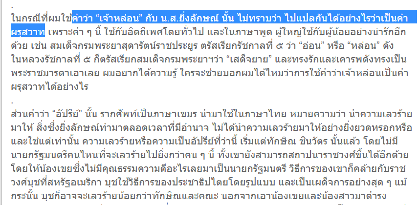มีคนส่งลิงค์ที่ศิวลักษณ์ตอบพระมหาไพรวัลย์ ในกรณีที่พระมหาไพรวัลย์ได้สะกิดท่านศิวลักษณ์ไปเรื่องการวิจารณ์คุณยิ่งลักษณ์มาให้อ่าน อ่านแล้วก็เห็นควรจะเป็นหน้าที่ของท่านพระหมาไพรวัลย์ที่จะตอบหรือไม่ตอบศิวลักษณ์ไป แต่ก็มีบางประเด็นที่ศิวลักษณ์เปิดใจกว้างเชื้อเชิญอย่างไม่เจาะจงว่า “ผมอยากได้ความรู้ ใครจะช่วยบอกผได้ไหมว่าการใช้คำว่าเจ้าหล่อนเป็นคำผรุสวาสได้อย่างไร” ผมจึงขอลองทำความเข้าใจ