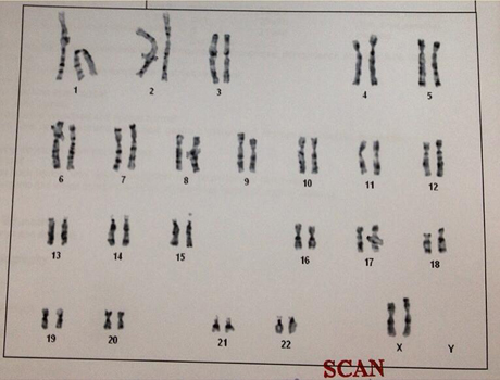 รูปตัวอย่างโครโมโซมที่เค้าเพาะจาก cell ของเด็กน้อยที่หลุดลอกในน้ำคร่ำค่ะ (หมอบอกว่าถ้าผิดปกติ คู่ที่ 21 จะมีโผล่มาอีก 1 แท่งค่ะ)
