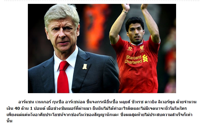 ข่าวเวนเกอร์ยื่นข้อเสนอซื้อ หลุยส์ ซัวเรส จากหงส์แดงเมื่อตอนต้นปีที่แล้วด้วยเงินจำนวน 50 ล้านปอนด์กับอีก 1 ปอนด์ ก็ไม่รู้ว่าแกยื่นแบบเอาจริง(โดยอาศัยช่องโหว่ของสัญญา)หรือยื่นเอาฮาเพื่อกวนร็อดเจอร์สกันแน่