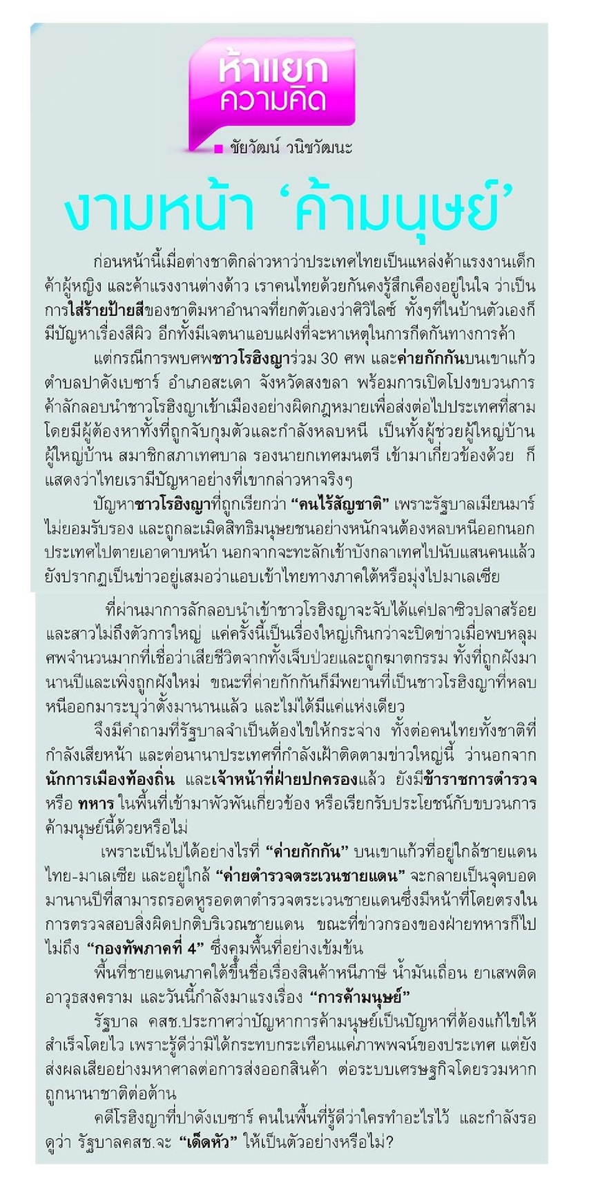 07/05/58 ฐานเศรษฐกิจ คอลัมน์ ห้าแยกความคิด: งามหน้า 'ค้ามนุษย์'