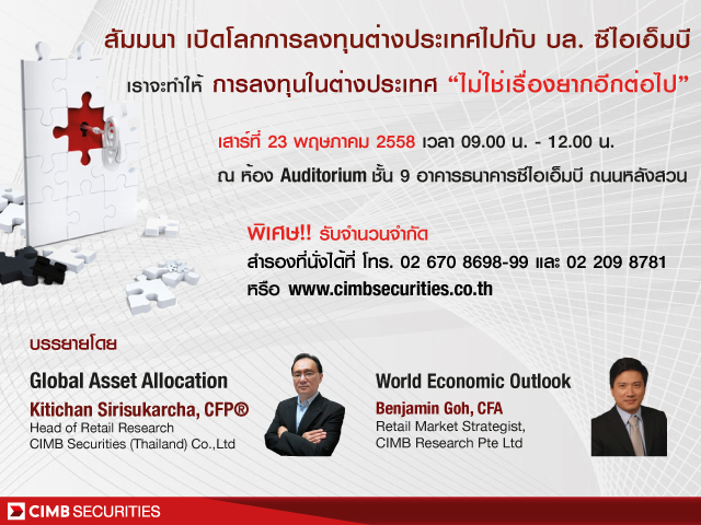 แจ้งข่าว - ขอเชิญนักลงทุนร่วมสัมผัสประสบการณ์การลงทุนระดับโลก ในงานสัมมนา"เปิดโลกการลงทุนต่างประเทศ กับ บล. ซีไอเอ็มบี"