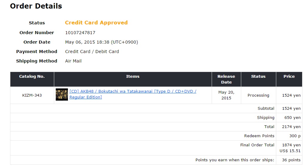 *2174 เยน = 1524 เยน(ค่าCDจริงๆ 422 บาท)+650 เยน(ค่าจัดส่ง 180 บาท)