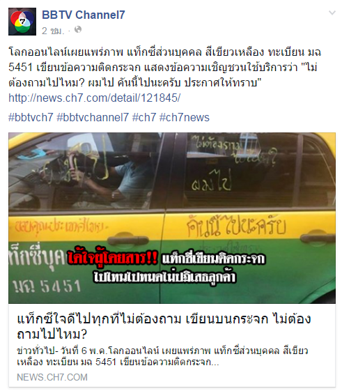 วันที่ 6 พ.ค.โลกออนไลน์ เผยแพร่ภาพ แท็กซี่ส่วนบุคคล สีเขียวเหลือง ทะเบียน มฉ 5451 เขียนข้อความติดกระจก แสดงข้อความเชิญชวนใช้บริการด้วยการเขียนว่า " ไม่ต้องถามไปไหม? ผมไป คันนี้ไปนะครับ ประกาศให้ทราบ"