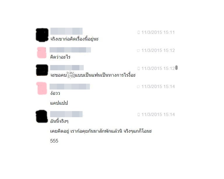 จนถึงวันครบรอบที่คุยกัน 1 เดือน คนนั้นก็ได้ขอคบเป็นแฟนกับเรา แต่เราไม่ได้ตกลง ก็ทำเป็นพูดเรื่องอื่น จนคนนั้นบอกว่าไม่เป็นไรถ้าพร้อมเมื่อไหร่ค่อยบอกก็ได้ หลังจากนั้น เราเลยบอกว่าทำไมถึงไม่รับตกลง เพราะเราคิดว่าเวลาแค่ 1 เดือน มันยังน้อยไปอ่ะ ให้เวลามันอีกนิดเรียนรู้นิสัยกันไปก่อนดีกว่า จนคนนั้นก็โอเคยอมรับ แต่ก่อนที่จะถึงวันนั้นที่คนนั้นขอคบ เรารู้เชิงมาก่อนล้ะ เพราะคนนั้นคุยในแชทเฟสกับเราว่า.. .