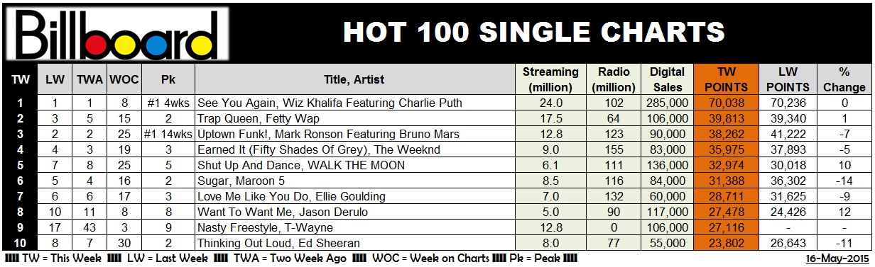 และแล้วก็มาถึงชาร์ตเพลงที่ใหญ่ที่สุด BB Hot100 ที่จะนำยอดทั้งยอดโหลด ยอดแอร์เพลย์ และยอดสตรีมมาคิดเป็นแต้มเพื่อนำไปเป็นอันดับสำหรับเข้าชาร์ต ซึ่งแชมป์ประจำสัปดาห์นี้ ก็ประดับอันดับ 1 ได้อย่างสวยงามกับเพลง “See You Again” ที่ยึดทั้งยอดโหลดและยอดสตรีม อีกทั้งยอดแอร์เพลย์ที่เพิ่มขึ้นเยอะส่งผลให้แต้มของเพลงนี้ลดลงไม่ถึง 1% ด้วยซ้ำ และที่สำคัญยอดยังสูงกว่าอันดับ 2 ประมาณ 78% เลยทีเดียว และมาดูต่อที่อันดับ 2 ที่สัปดาห์นี้น่าสนใจมากๆ เมื่อแชมป์เพลงโหดประจำปีนี้อย่าง “Uptown Funk” ของ Mark Ronson (feat. Bruno Mars) ตกอันดับไปแล้ว โดยเพลงที่ขึ้นมาแทนที่คือ “Trap Queen” ด้วยอานิสงค์ของยอดสตรีม และยอดโหลดที่เพิ่มขึ้น ทำให้เพลงนี้แซงมาอยู่ที่อันดับ 2 ไล่ “Uptown Funk” ร่วงไปเป็นอันดับ 3 ด้วยยอดที่ลดลง 7% ซึ่งถึงแม้เพลงนี้จะร่วงไปอันดับ 3 แต่เพลงก็สามารถสร้างสถิติใหม่ คือเป็นเพลงที่อยู่ใน Top3 นานที่สุดในประวัติศาสตร์ที่ 21 สัปดาห์