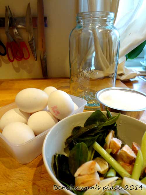 นำขวดแก้วไปต้มในน้ำเดือดเพื่อฆ่าเชื้อ นำไข่ลงไป เทน้ำเกลือที่เราพักเอาไว้ให้เย็นในโหลไข่
