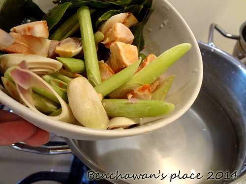 จากนั้นก็นำข่า ตะไค้ร ใบมะกรูด ใส่ลงไปต้มให้เดือดอีกประมาณ 5 นาที ปิดไฟแล้วก็ปล่อยให้เย็นคะ