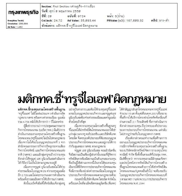 09 กุมภาพันธ์ 2557 DTAC สนใจ TRUEIF โดยกำลังขอดูรายละเอียดทรัพย์สินกองทุน ซึ่งประกอบด้วยเสาโทรคมนาคม จำนวน 6,000 ต้น และ สายไฟเบอร์ออพติก เพื่อศึกษาข้อมูลว่าจะทำสัญญาการเช่าหรือไม่ ประเด็นหลัก นอก