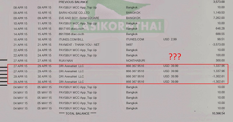 ได้รับใบแจ้งยอดบัตรเครดิตกสิกรมาวันนี้ ปรากฏว่ามีรายการแปลกๆ DRI ArenaNet LLC ตัดเงิน USD 39.99 ไป 2 ครั้งจากนั้นก็คืนเงินให้ในวันถัดมา รายการนี้เกิดขึ้นได้อย่างไรคับ