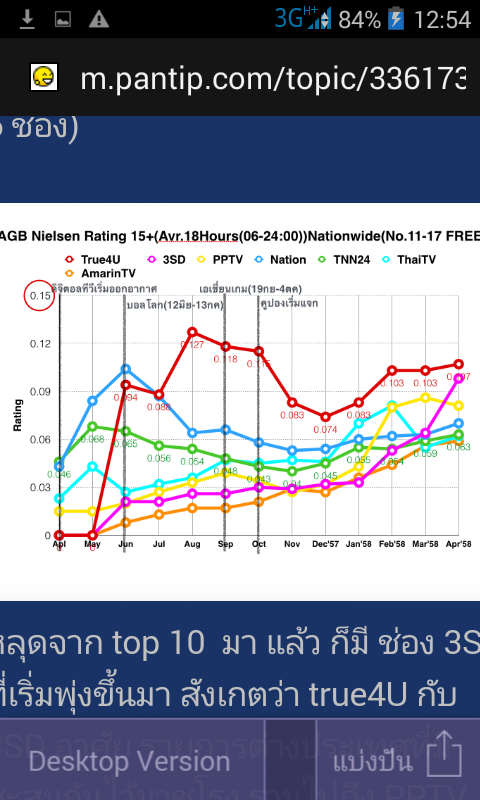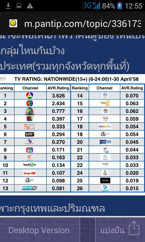 Rating เฉลี่ย ทั่วประเทศ(รวม กทม) 15+ (6-24:00)(1-13มีค) 1: ช่อง7: 3.341 2: ช่อง3: 2.496 3: ช่องworkpoint: 1.194 4: ช่อง mono: 0.675 5: ช่อง8: 0.564 6: ช่องวัน: 0.500 7: ช่อง3sd : 0.280 8: ช่อง9: 0.25