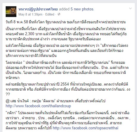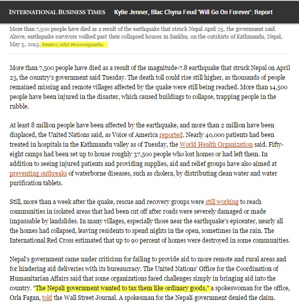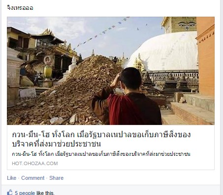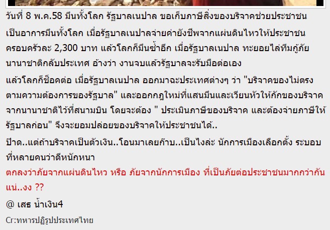 เมื่อวานเปิด Facebook มาเจอเพื่อ share ข่าวจากเว็บนึง พาดหัวว่ารัฐบาลเนปาล ขอเก็บภาษีของบริจาคที่ส่งมาช่วยประชาชน