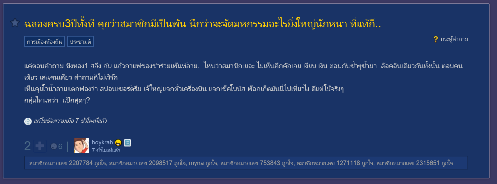 คุยว่าสมาชิกเป็นพัน : อันนี้ถามจิ้งจก น่าจะได้คำตอบว่า เลขสมาชิกสุดท้ายอยู่แค่ 500 กว่า ๆ เอง ใครที่ไหนไปคุยว่ามีเป็นพัน มีแต่พวกที่หาเรื่องใส่ร้ายพูดเรื่อยเปื่อย แล้วทำให้พวกที่ฟังแล้วไม่คิดตาม จำไปแบบผิด ๆ