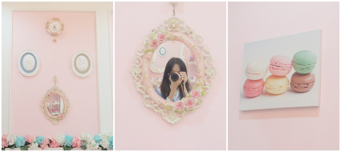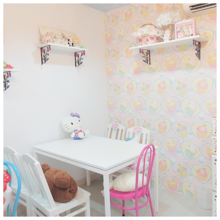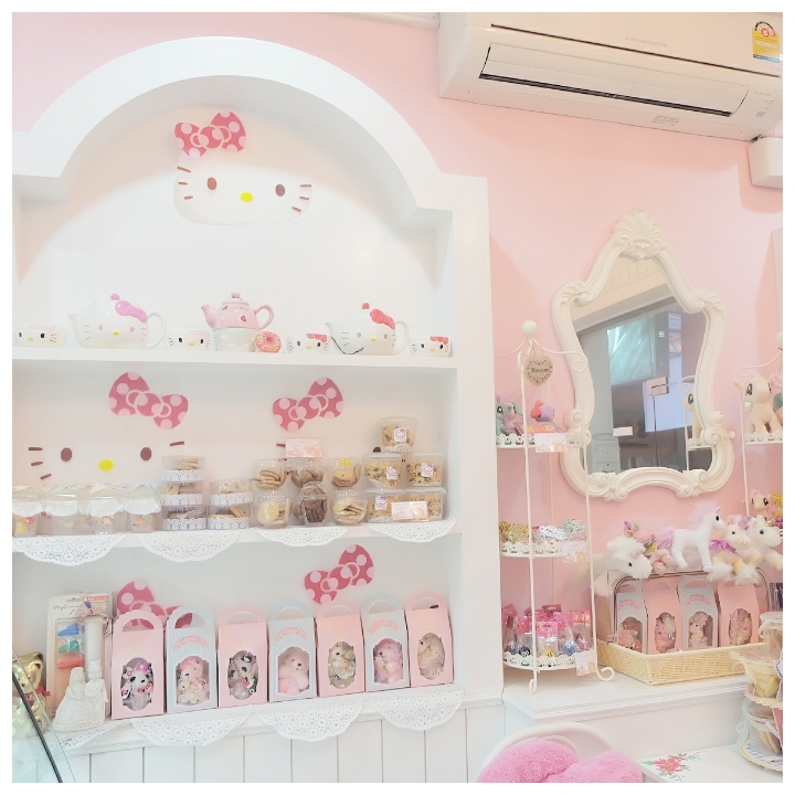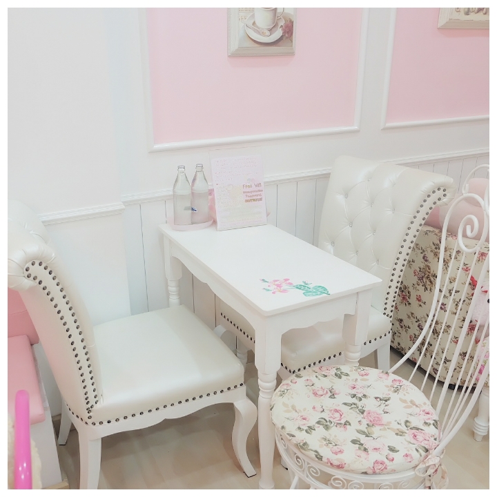 โต๊ะเก้าอี้สีขาวเข้ากับร้านสีหวานๆ อิอิ