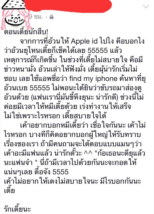 จนเริ่มบอกเรา ว่าเห็นหมดแล้วน่ะ โหยยย อายมาก 555 เลยต้องจำยอมให้ดูเฟสนั้นเรื่อยๆ แต่ก็กลายเป็นอะไรที่น่ารักมากขึ้น เรายังคงเขียนต่อไปในแต่ละวันของเรื่องราวของเรา 2 คน แต่มีสิ่งที่พิเศษมากกว่าเดิมคือ แฟนจะเข้ามาเม้นท์ตอบ หรือแม้กระทั่งตั้งโพสใหม่ให้เราอ่านด้วย