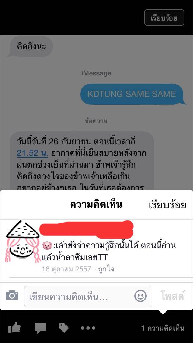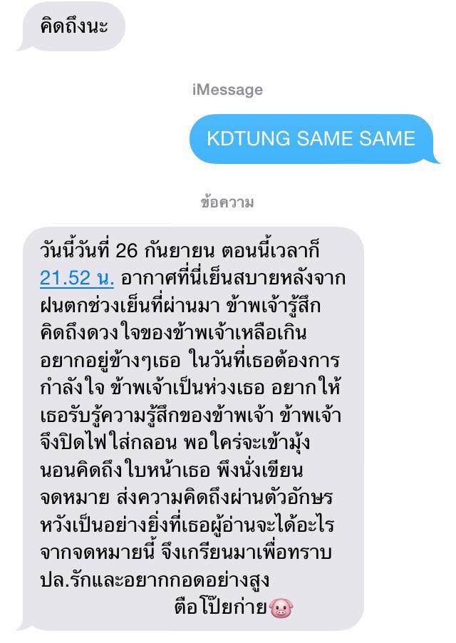 พอดีแฟนต้องไปทำธุระ และต้องนอนค้างที่ต่างจังหวัด แล้วตรงที่เขาอยู่ไม่มีสัญญาณโทรศัพท์เลย จะมีทีก็ขีดเดียว ไอ้เราก็จะสอบจบพรุ่งนี้ ทั้งเครียด ทั้งคิดถึง จนเขาส่งข้อความนี้มา โหยยยยย น้ำตาไหลเลย TT^TT