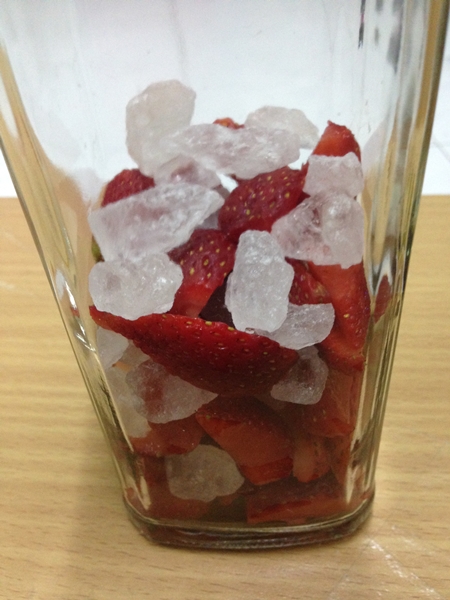 ก่อนอื่นล้างทำความสะอาดสตอเบอร์รี่ให้เรียบร้อยก่อน แล้วหั่นครึ่งค่ะ พอดีหาโหลแก้วไม่ได้เอาเป็นขวดแก้วไปก่อนละกันนะคล้ายๆกัน เลยต้องหั่นชิ้นบางๆหน่อย