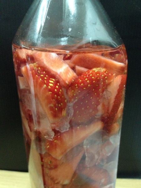 แล้วค่อยๆเอาสตอเบอร์รี่ที่เราหั่นแล้วเรียงใส่ขวดสลับกับน้ำตาลกรวดเป็นชั้นๆไปเรื่อยๆเลยค่ะ