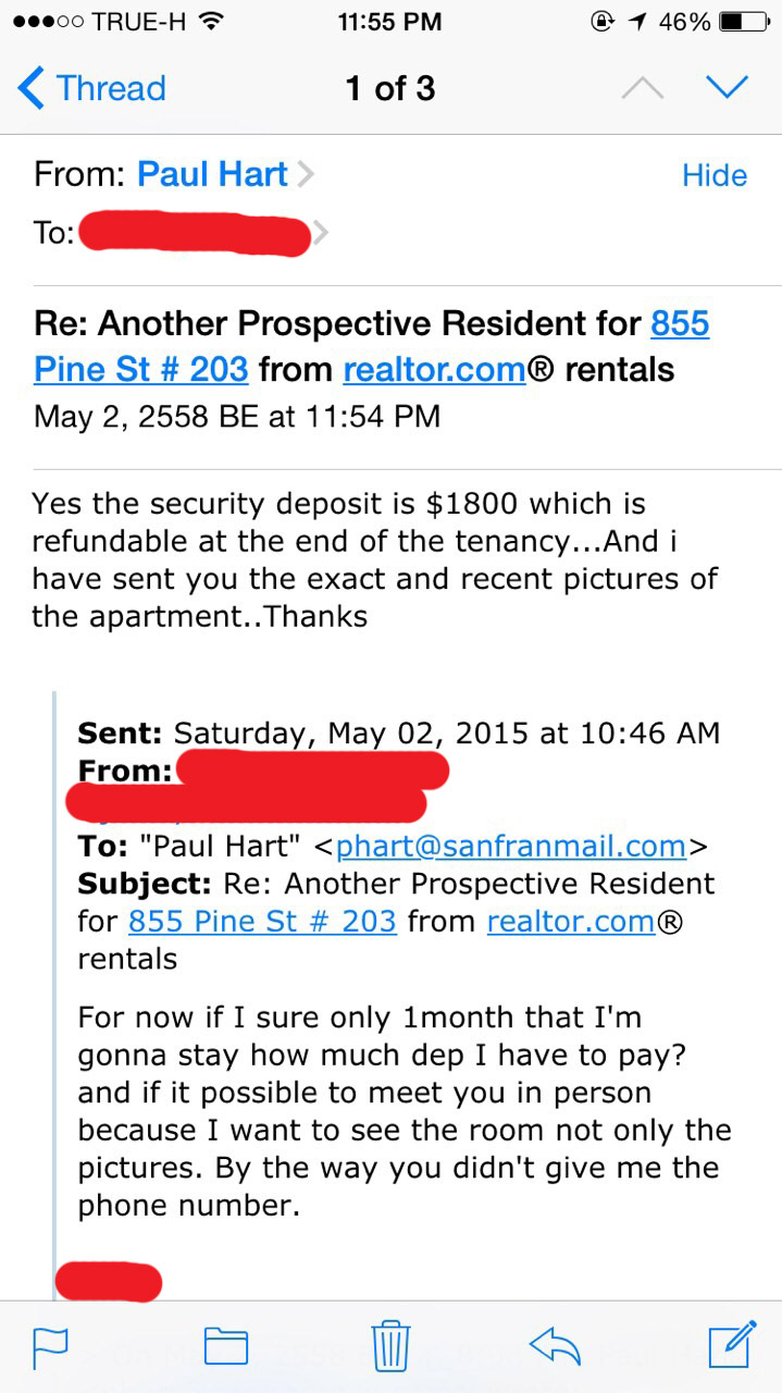 โดยที่มันเรียกมัดจำจากเราตั้ง $3,600 อีกสิ่งหนึ่งคือแฟนเราขอเบอร์โทรมันและถามว่า “เป็นไปได้มั้ย ถ้าจะนัดเจอเพื่อดูห้อง”