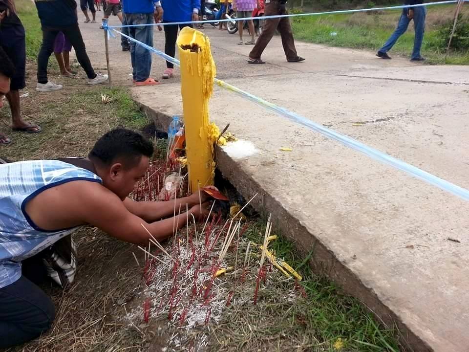 วันที่ 30 พ.ค. ผู้สื่อข่าวรายงานว่า บริเวณถนนสาย 218 บุรีรัมย์-นางรอง ก.ม.ที่ 22 บ.บุลาว ต.สะแกโพรง อ.เมือง จ.บุรีรัมย์ ชาวบ้านและผู้สัญจรไปมาพากันนำสิ่งของ และน้ำแดงมาเซ่นไหว้หลักกิโลเมตรบอกระยะทาง โ